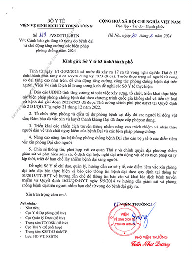 Tính từ ngày 01/1 - 20/2/2024 cả nước đã xảy ra 17 ca tử vong nghi dại/do dại ở 13 tỉnh/thành phố, tăng 08 ca so với cùng kỳ năm 2023 (09 ca). Trước thực trạng số người tử vong do bệnh dại tăng cao như trên, để chú động tăng cường công tác phòng chống bệnh dại trên người, Viện Vệ sinh Dịch tễ Trung ương - Bộ Y tế đã ban hành Công văn số 189/VSDTTƯ-BTN ngày 20/02/2024 về việc Cảnh báo gia tăng tử vong do bệnh dại và chủ động tăng cường các biện pháp phòng, chống bệnh dại năm 2024.