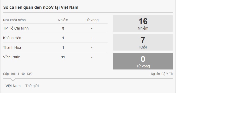 Bộ Y tế trưa 13/2 xác nhận bệnh nhân nam 50 tuổi ở Vĩnh Phúc dương tính với nCoV, là ca thứ 16 tại Việt Nam.