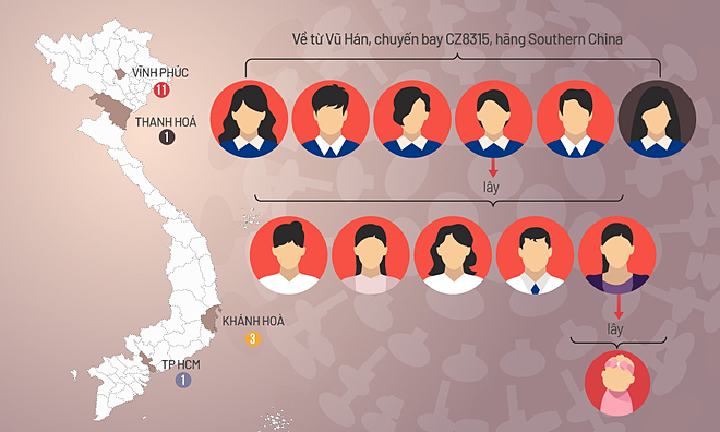Đường lây nhiễm 16 ca nCoV ở Việt Nam (bấm vào hình để xem). Đồ họa: Tiến Thành.