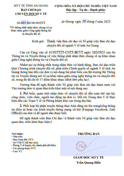 | Mô tả | Thống nhất trong nhận thức và hành động, Ban chỉ đạo triển khai Chương trình chuyển đối số, phát triển Chính quyền số ngành Y tế tỉnh An Giang |